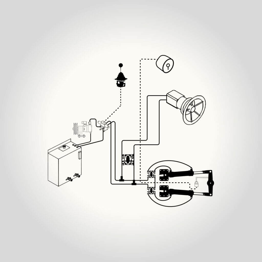 Unlike electronic systems, this configuration is powered directly by the engine, utilising a hydraulic pump to generate steering assistance. The system integrates a hydraulic circuit with responsive control valves and a user-friendly joystick, making it well-suited for heavy-duty applications such as fishing boats, barges and other vessels